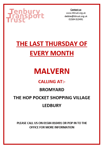 Every Thursday, Tenbury Transport Trust runs a minibus service to Malvern, via Suckley and Alfrick. Customers can browse a variety of independent shops and retailers in Great Malvern, or visit Malvern Shopping Park where shops include Marks and Spencer, Boots, Argos and Next among others.